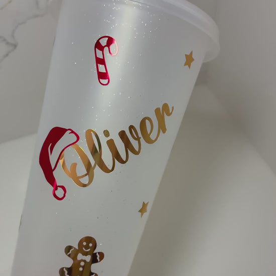 Each cup features a glittery finish and can be customised with your name in festive colours and designs.