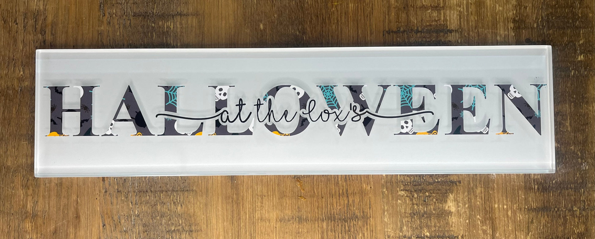 A lovely halloween decoration to bring out year after year. The high quality personalised sign is a lovely addition to the Halloween tradition. The plaque is decorated with the wording ‘Halloween’ and then can be personalised with a family name/children’s names in the centre. The tile comes in 2 colour option: Orange/purple/black pumpkin design with gold foil Or Grey/orange/blue spider and skull with grey foil. Other colour options can be catered to on request. The tile is made from thick, high quality glass and comes with 2 stands to display. It could also be attached to the wall with command strips. The white, glass tile measures 30cm, is 7.5cm high and 6mm wide. Each high quality glass tile weighs approx 330g. It also comes with a stand to display the tile. Any questions then please feel free to ask ☺️💀🎃